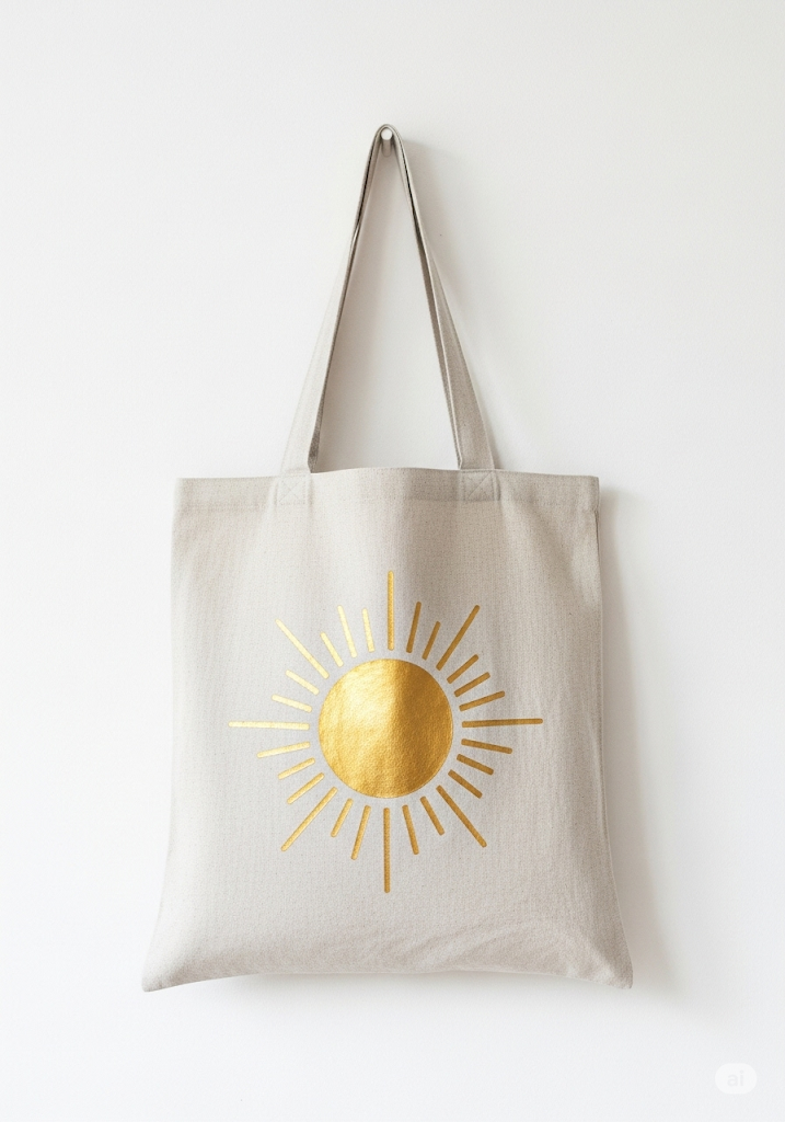 Ekologiczna torba lniana z subtelnym, złotym motywem słońca. Wytrzymała i stylowa, idealna na zakupy lub plażę.